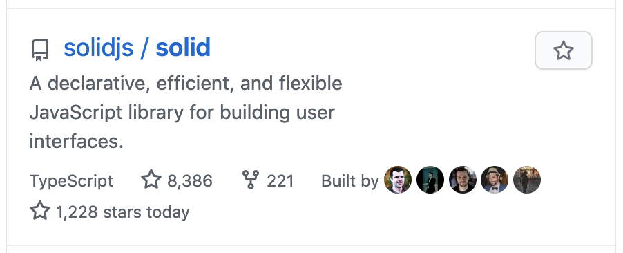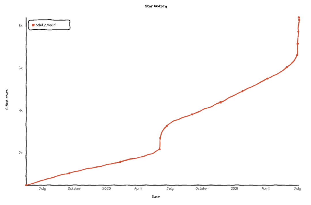 要知道,现在的 JavaScript 开发框架基本就是 React、Vue、Angular 三分天下,还有就是新兴的 Svelte 框架潜力无限(近 5w star),其他框架想分蛋糕还是很难的。那么 Solid 到底有什么本事,能让他连续几天 star 数暴涨呢?