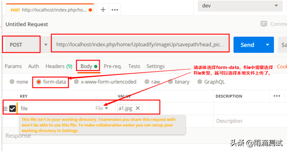 在请求中设置以上四个参数,点击Send按钮。注意:在postman中设置请求体类型,需要选择body-> form-data 。file中要选择File类型,然后上传本地的文件 。