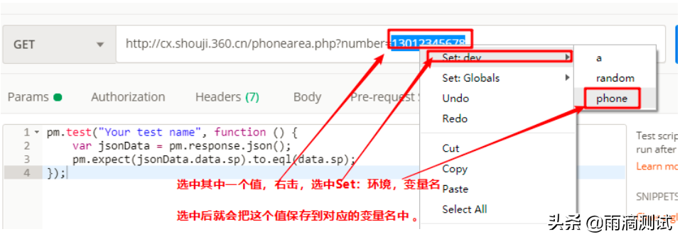 2. 在以上的位置把想要的值选中右击,选中Set:环境|全局 ,选中一个变量名,点击后就会保存到这个变量中