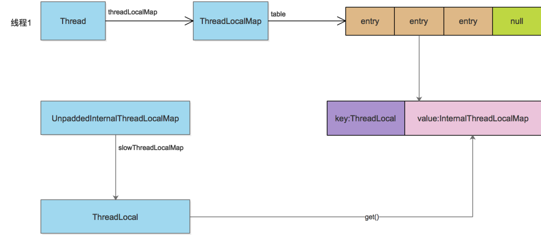 从ftl看,退化操作的整个流程是:从一个jdk的ThreadLocal变量中获取InternalThreadLocalMap,然后再从InternalThreadLocalMap获取指定数组下标的值,对象关系示意图: