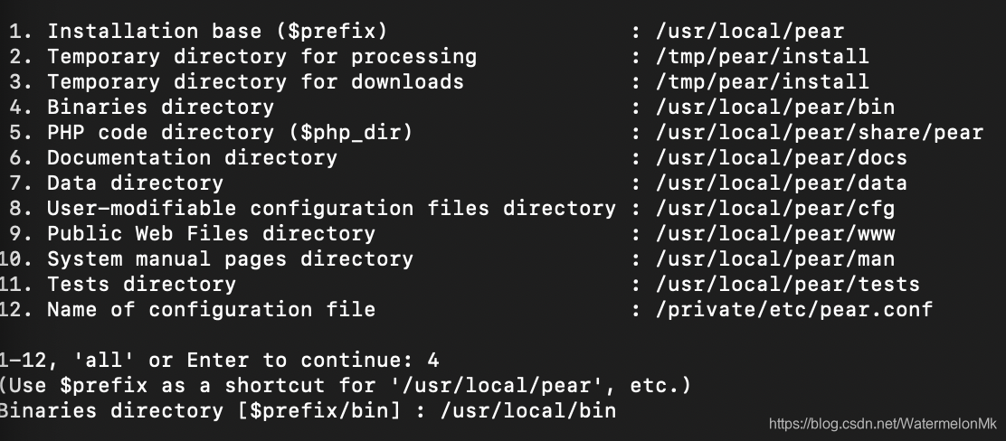 输入1:回车,配置pear路径为:/usr/local/pear