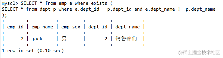 第二行记录与子查询比较时,发现 销售部门 与 dept 表第二行 销售部 对应不上,返回 true,所以主查询该行记录会返回。