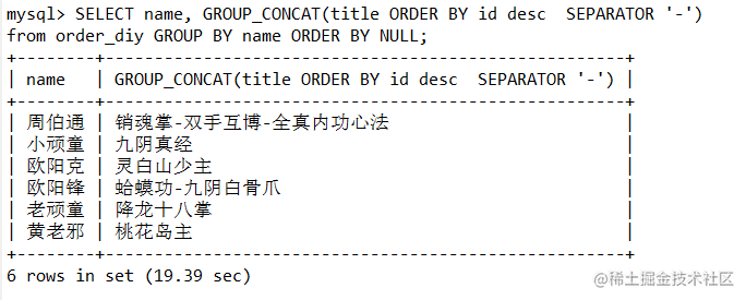 如上我们通过 「GROUP_CONCAT(title ORDER BY id desc SEPARATOR '-')」 语句,指定分组连接 title 字段并按照 id 排序,设置连接字符串为 -。