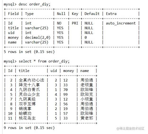 MySql 中的排序 ORDER BY 除了可以用 ASC 和 DESC,还可以通过**ORDER BY FIELD(str,str1,...)**自定义字符串/数字来实现排序。这里用 order_diy 表举例,结构以及表数据展示: