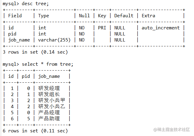 tree 表中通过 pid 字段与 id 字段进行父子关联,假如现在有一个需求,我们想按照父子层级将 tree 表数据转换成 一级职位 二级职位 三级职位 三个列名进行展示,sql 如下: