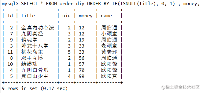 ORDER BY 字句中可以跟我们要排序的字段名称,但是当字段中存在 null 值时,会对我们的排序结果造成影响。我们可以通过 「ORDER BY IF(ISNULL(title), 1, 0)」 语法将 null 值转换成0或1,来达到将 null 值放到前面还是后面进行排序的效果。
