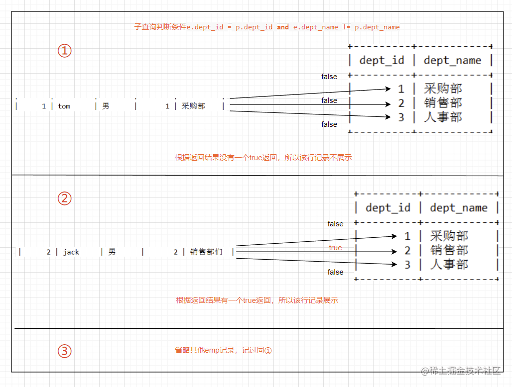 我们通过 exists 语法将外层 emp 表全部数据 放到子查询中与一一与 dept 表全部数据进行比较,只要有一行记录返回true。画个图展示主查询所有记录与子查询交互如下: