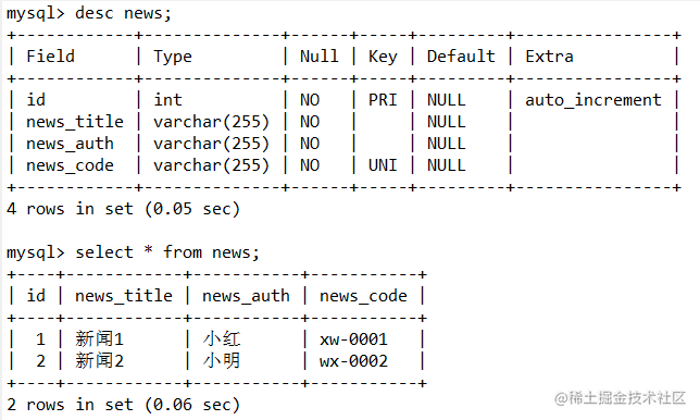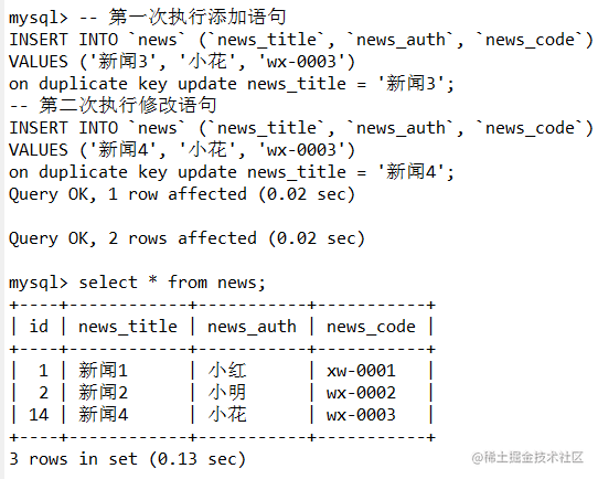 -- 第一次执行添加语句INSERT INTO `news` (`news_title`, `news_auth`, `news_code`) VALUES ('新闻3', '小花', 'wx-0003') on duplicate key update news_title = '新闻3';-- 第二次执行修改语句INSERT INTO `news` (`news_title`, `news_auth`, `news_code`) VALUES ('新闻4', '小花', 'wx-0003') on duplicate key update news_title = '新闻4';
