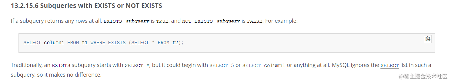 我猜大家在日常开发中,应该都对关键词 exists 用的比较少,估计使用 in 查询偏多。这里给大家介绍一下 exists 用法,引用官网文档: