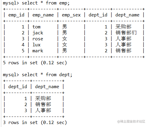 这里继续使用上文提到的 emp 表和 dept 表,数据如下: