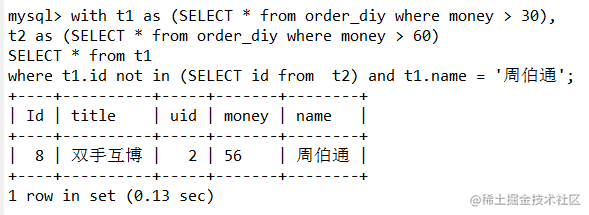 -- 使用 with aswith t1 as (SELECT * from order_diy where money > 30),t2 as (SELECT * from order_diy where money > 60)SELECT * from t1 where t1.id not in (SELECT id from t2) and t1.name = '周伯通';