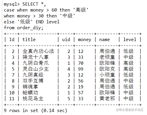 SELECT *, case when money > 60 then '高级' when money > 30 then '中级' else '低级' END level from order_diy;