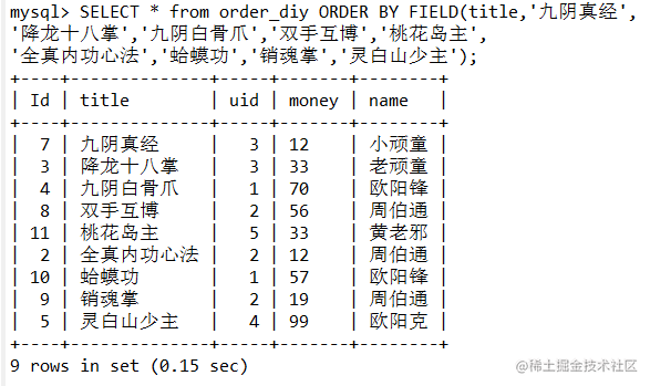 SELECT * from order_diy ORDER BY FIELD(title,'九阴真经', '降龙十八掌','九阴白骨爪','双手互博','桃花岛主','全真内功心法','蛤蟆功','销魂掌','灵白山少主');