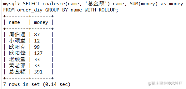 SELECT coalesce(name, '总金额') name, SUM(money) as money FROM order_diy GROUP BY name WITH ROLLUP;
