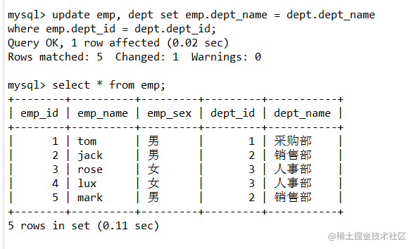 可以看到上述 emp 表中 jack 的部门名称与 dept 表实际不符合,现在我们想将 jack 的部门名称更新成 dept 表的正确数据,sql 如下: