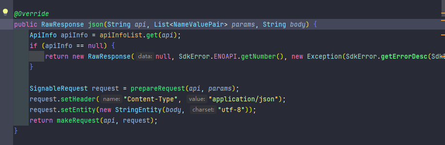 好在我翻阅他们 SDK 源码中找到一个靠谱的 json(...) 请求方法,来完成这个 POST JSON 请求。