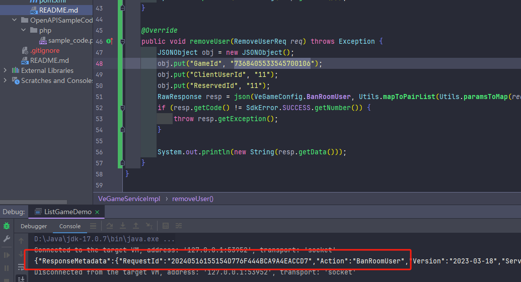 但是在官方文档中 BanRoomUser 接口是一个 POST JSON 格式的请求。官方给出的 OpenApi 示例 demo 中并没有关于 POST JSON 请求的示例代码,所以只能靠我一个人查看他们提供的 SDK 依赖源码硬猜来写...,这就很让人头痛了。