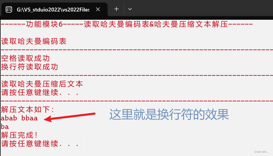 #include <iostream> #include <queue> #include <unordered_map> #include <string> #include <fstream> #include <windows.h> #include <commdlg.h> #include <conio.h> using namespace std; //----------------------------------------------------------------------------------------------------------------------------- //全局变量 int key;//控制整体key事件 string text;//用于读取文本和哈夫曼压缩文本 string line; int cnt = 0;//用于读取文本的字符数 unordered_map<string, char> codes; // 储存哈夫曼编码表//用于功能6 // 结点类 class Node { public: char ch; // 字符 int freq; // 字符出现频率 Node* left; // 左孩子 Node* right; // 右孩子 Node() {} Node(char c, int f) { ch = c; freq = f; left = nullptr; right = nullptr; } ~Node() { delete left; delete right; } }; //----------------------------------------------------------------------------------------------------------------------------- //----------------------------------------------------------------------------------------------------------------------------- //函数区域 void menu();//打印选项菜单 void menuone();//打印次级选项菜单 void KeyEvent();//总体的选项事件 int readInfo();//使用者自主选择读入一段文本; void readInfoHand();//读取一个Txt文本(但是目前只开发了英文和标点符号的) // 建立哈夫曼树 Node* buildHuffmanTree(unordered_map<char, int>& freqMap); // 哈夫曼编码哈希表 void buildHuffmanCode(Node* root, string code, unordered_map<char, string>& huffmanCode); // 哈夫曼编码压缩 string compress(string text, unordered_map<char, string>& huffmanCode); // 哈夫曼解码,返回原始文本 string decompress(string compressedText, Node* root); void Hafuman();//哈夫曼编码压缩主体函数 void gotoxy(int x, int y);//光标定位 void changeColors();//改变控制台颜色函数 void HafumanYasuoShuchu();//哈夫曼编码压缩文本输出 void HafumanYasuoNumberShuchu();//哈夫曼编码的数量排序 void HafumanYasuoBianmaShuchu();//哈夫曼编码的展示 int getCompressedLength(const string& text, const unordered_map<char, string>& huffmanCode);//统计压缩后的字符数位数 int readInfoBiao();//用于功能6,读取哈夫曼编码表 int readInfoWenben();//用于功能6,读取哈夫曼压缩后的文本 void Jiema();//功能6,解码的函数汇总 //---------------------------------------------------------------------------------------------------------------------------- int main() { changeColors(); while (1) { menu(); KeyEvent(); if (key == 27)break; system("pause"); system("cls"); //清屏 } system("cls"); //清屏 return 0; } void KeyEvent() { key = _getch(); switch (key) { case 27: system("cls"); cout << "------退出中------" << endl; system("pause");