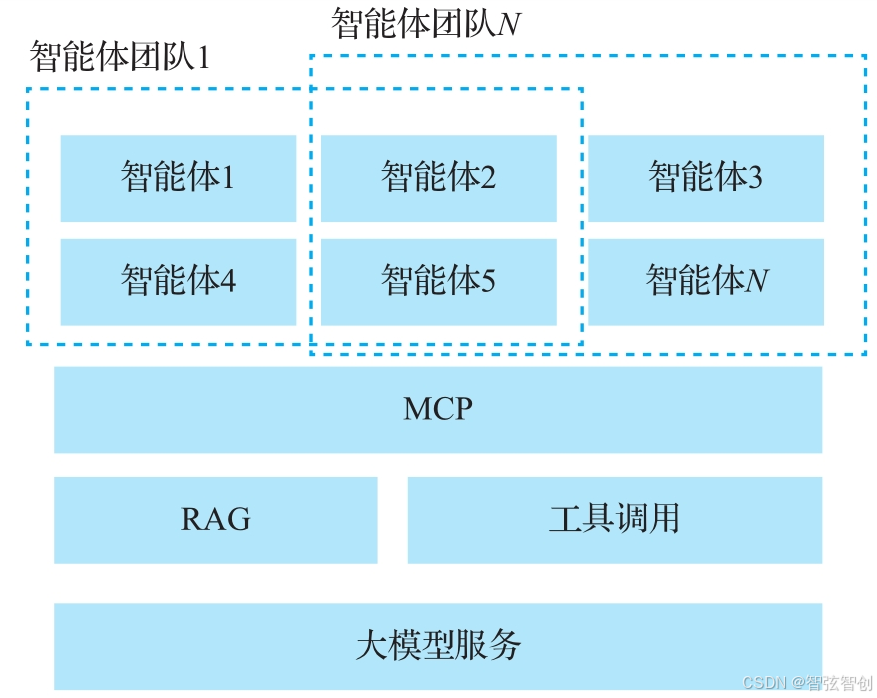 最妙的是,智能体能根据需求变身。开发者在后台给它装不同“技能卡”:有的负责写代码,有的负责检查错误,有的负责向人类确认细节。就像搭积木一样,组合不同功能就能打造出订票专员、数据分析师、智能客服等不同岗位的智能体团队(Multi-Agent技术),如图2所示。