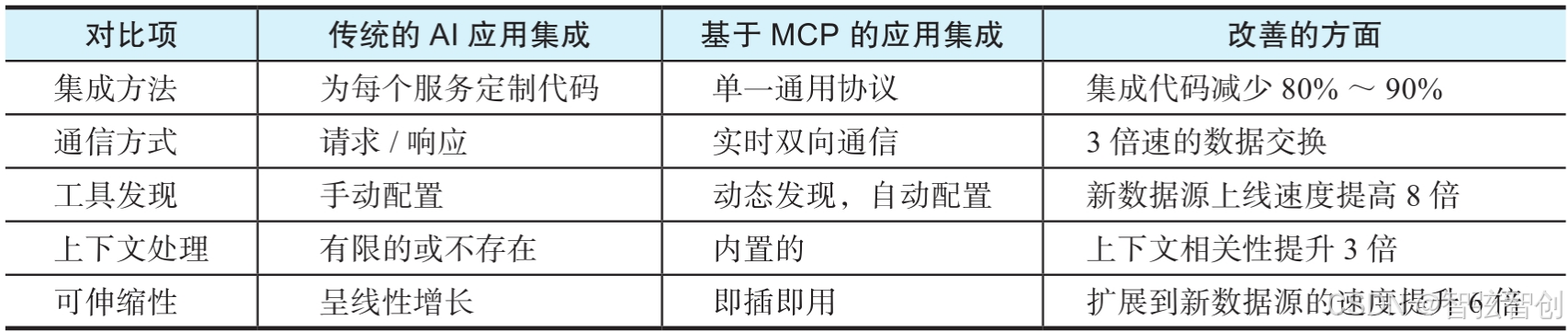 这种比较突出了MCP的变革潜力。通过使用标准化协议替换定制集成,组织可以显著减少开发时间和维护工作。