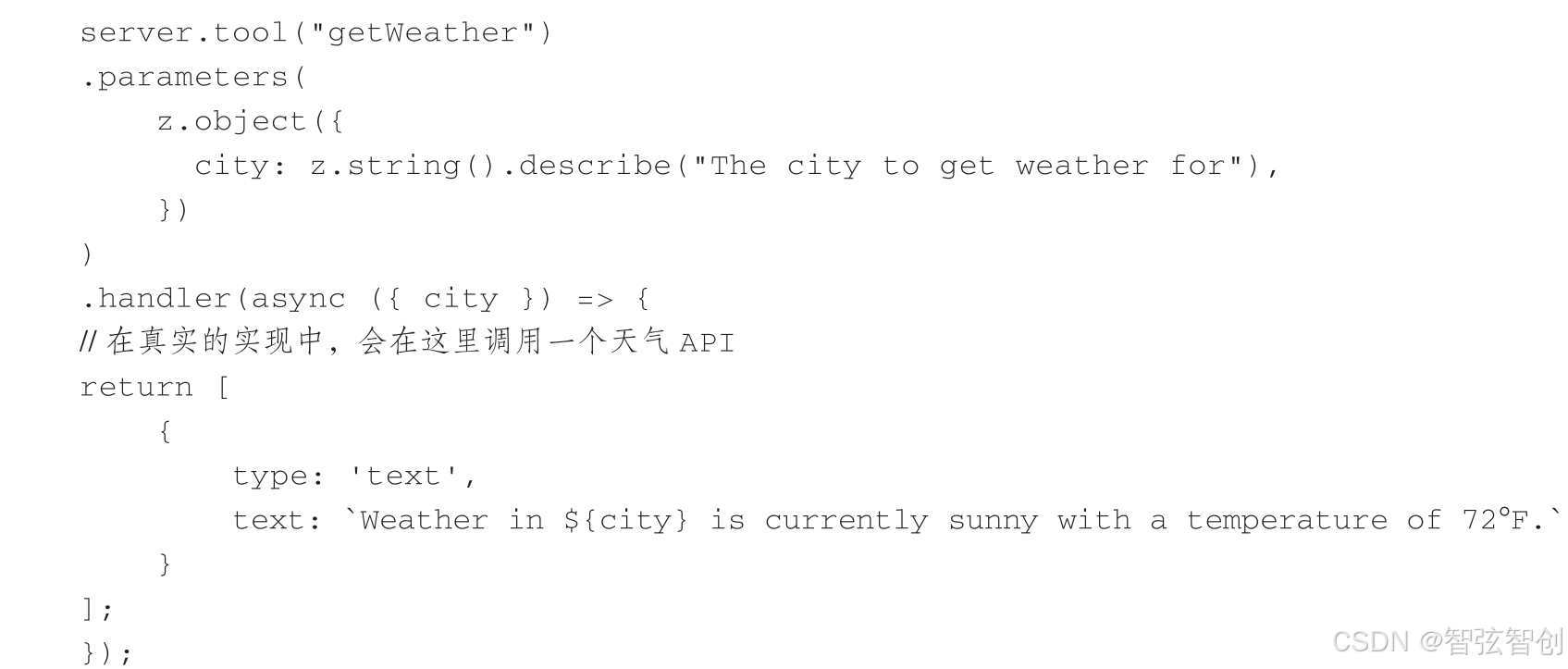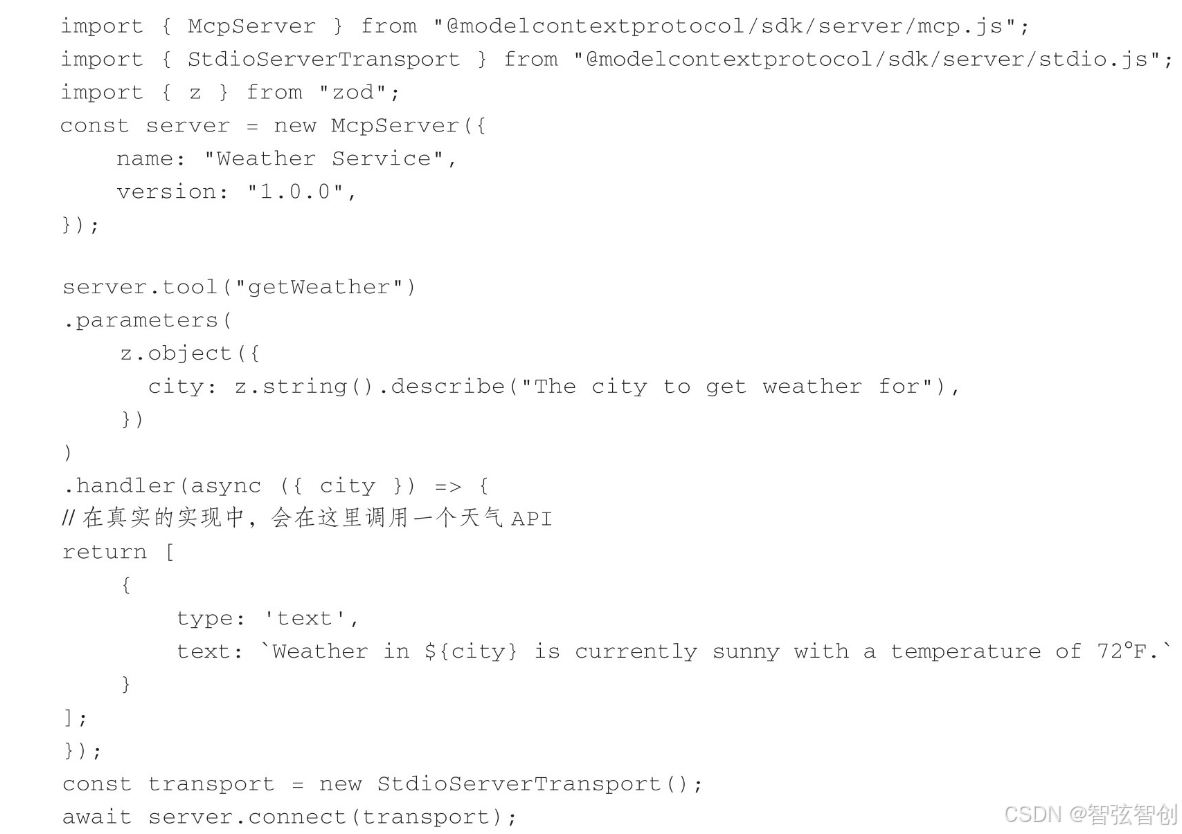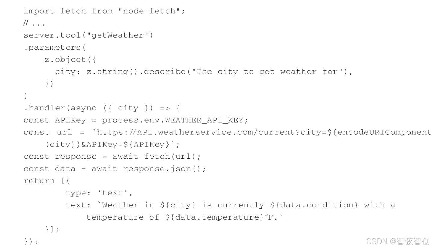 以上代码定义了一个名为getWeather的工具,我们指定这个工具接收一个带有单个参数city的对象,city是一个字符串。同时,它实现了一个在调用工具时执行的处理函数,处理程序返回一个内容对象数组,在本例中仅返回一条文本消息。在真实的场景中,处理程序可能会对天气服务进行API调用,并返回实际的天气数据。