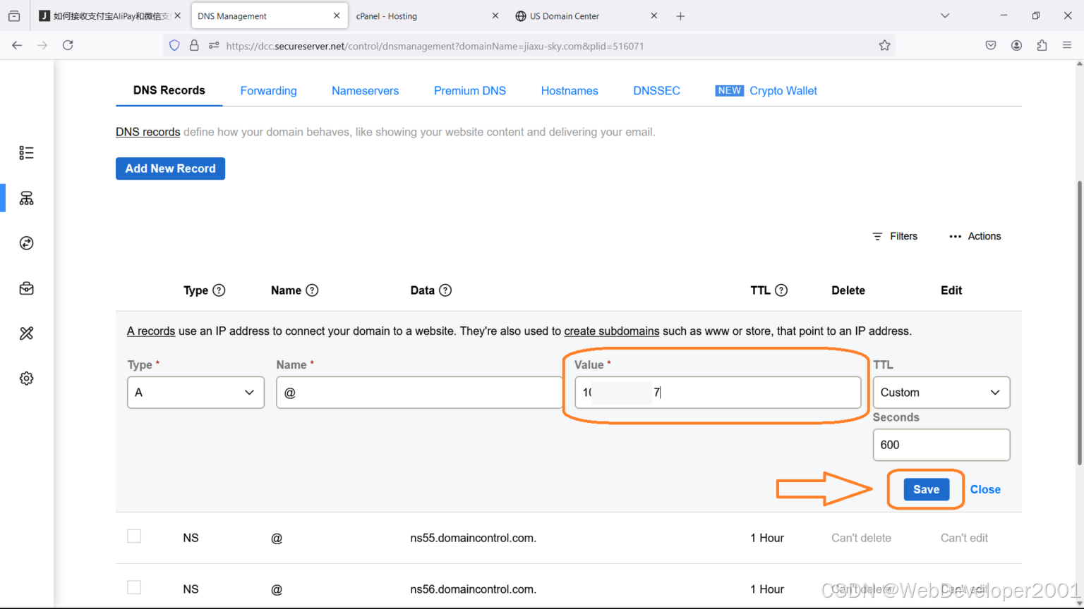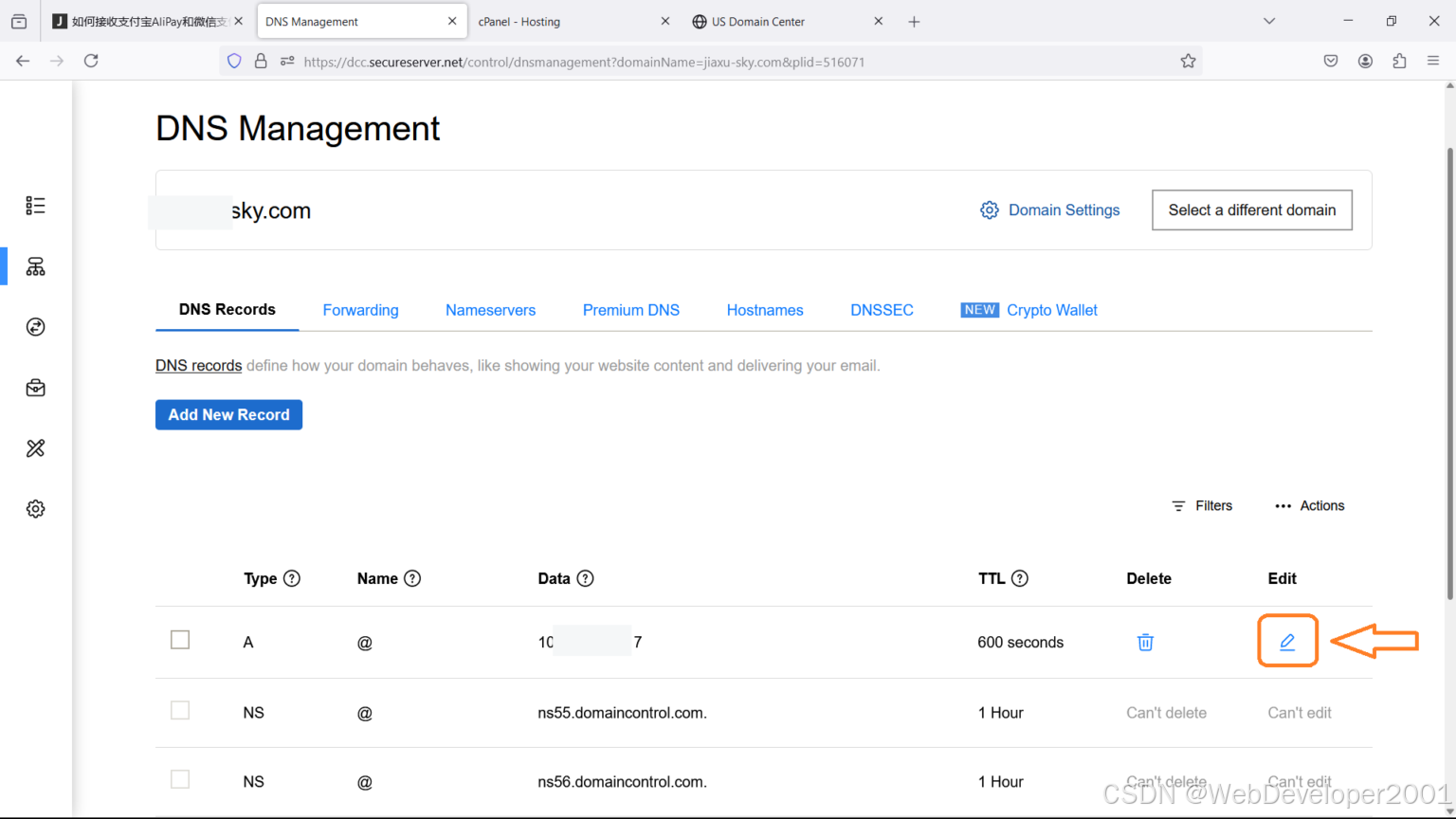 第4步: 点击 A 记录右边的笔 (来编辑)。