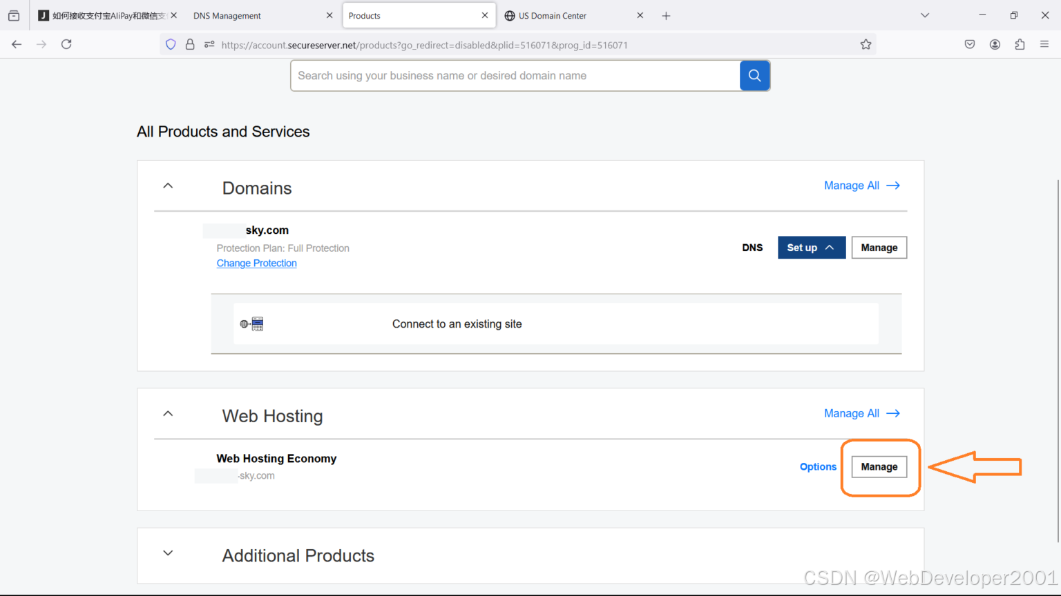 第1步: 登录US Domain Center 账户,在产品中心 All Products and Services,点击 Web Hosting 右边的 Manage。