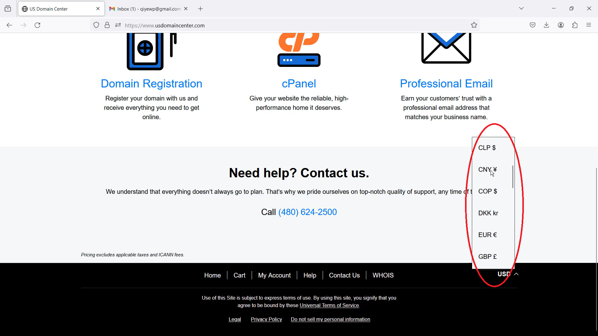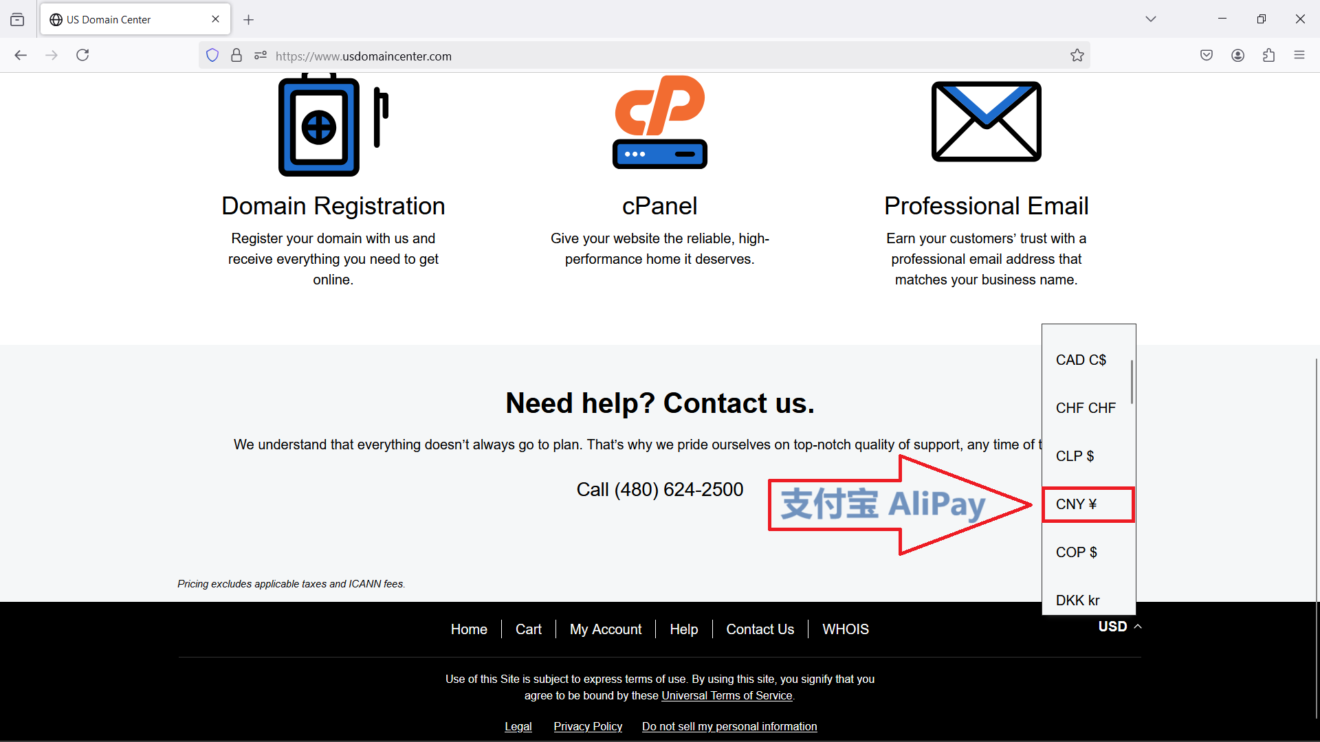 1.2 在右下角选择想要使用的货币,如CAD加币、CNY人民币或USD美元 (可以使用支付宝,信用卡,PayPal等)。(如果有任何技术问题,可以通过电邮或电话联系24小时客户服务)