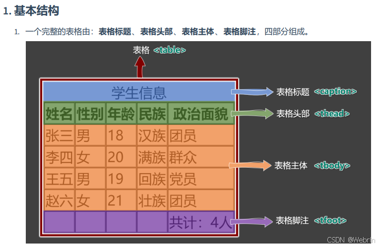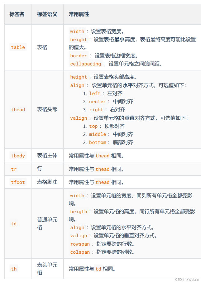 th 、 td :每一个单元格(备注:表格头部中用 th ,表格主体、表格脚注中用: td )