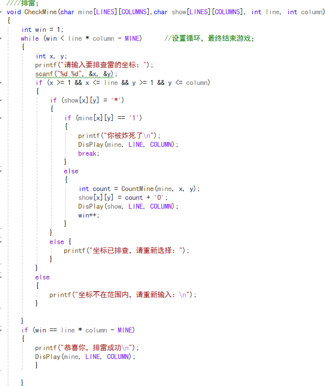 6,最后就是排雷了,因为这里会用到两个数组,所以将两个数组以函数形参的形式传过去,采用循环结构,若用户一直没有排到雷,则循环进行排雷,若排到最后还为排到雷,则循环退出;为了让用户输入有效的坐标,用if语句实现判断,如果在有效坐标内,则进行排雷,否则提醒用户重新输入有效坐标。如果用户排的那个坐标是雷,则输出炸死语句,并且将透明棋盘打印出来,然后结束游戏;