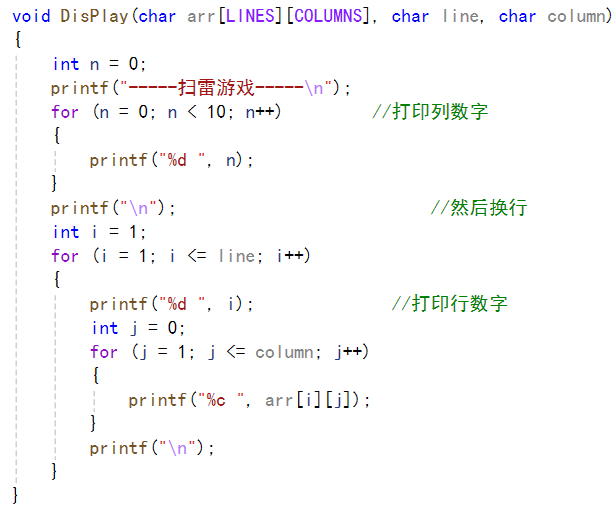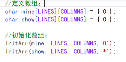 这里为什么要定义两个数组呢? 其实一个棋盘是透明的,可以清晰看到布雷的位置,这个棋盘是不被用户看到的,而另一个则是用户真正玩的棋盘,用户选择排坐标进行排雷后,如果是雷则炸死了,然后把第一个透明棋盘打印出给用户。若果不是,则从第一个透明棋盘中计算排雷坐标周围10个坐标总共有几个雷并且将其打印到用户玩的棋盘排雷的那个坐标上;