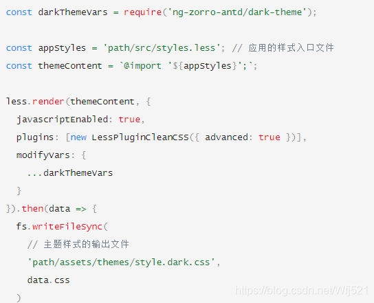 官网的说法是以暗黑主题为例,如果你用的官方的那么你的modifyVars 参数就可以参照官网来,如果不是请屏蔽掉它。然后在appstyles这个样式你们引入你要的模板样式,然后在添加你想要覆盖的样式,你也可以在modifyVars 中加入你要覆盖的样式,需要覆盖的比较多的话不推荐这种方式;然后在终端或者cmd中运行“node .\theme.js”(theme.js就是是你自己写的文件名称),在你的主题样式输出文件位置就会生成对应的css文件(不要写成less,不然你的样式在本地是不生效的,据说是用打包工具后可以生效不过我么有尝试过)