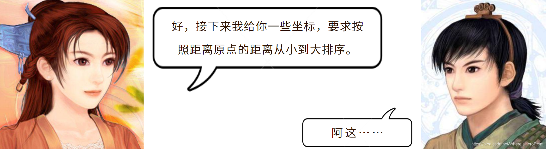 【例题6】给定 n ( 2 ≤ n ≤ 1000 ) n(2 \le n \le 1000) n(2≤n≤1000),然后给出 n n n 个整数坐标 ( x i , y i ) (x_i, y_i) (xi,yi),坐标范围 ( − 100 < x i , y i < 100 ) (-100 < x_i, y_i < 100) (−100<xi,yi<100),求将坐标按照离原点距离从小到大输出。