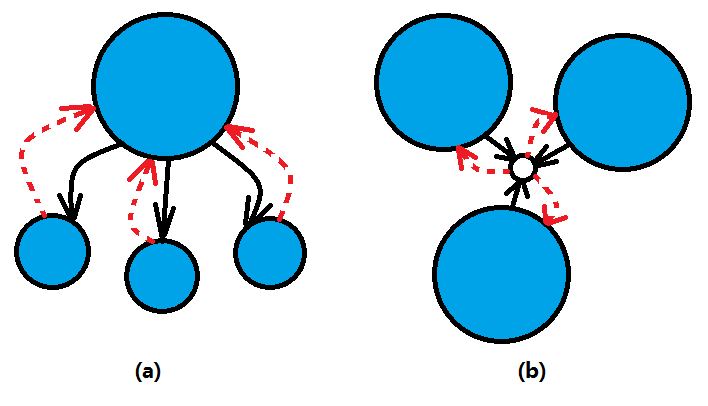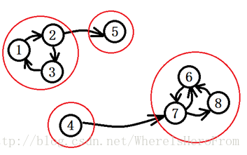 题解:对原图求一次强连通,如果强连通分量个数已经为1,则不需要添加边;否则,进行缩图,缩完后的图统计两个量:入度为0的点的个数x,出度为0的点的个数y,需要添加的边数为max(x, y)。如图1所示,蓝色圈中的顶点属于同一个强连通分量,红色虚线代表需要添加的边。从图中可以看出需要添加的边只和入度为0或者出度为0的顶点有关。
