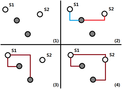 题意:如图9-(1),有两个中转点S1和S2,以及N(N <= 500)个灰色点,现在要求把灰色点和中转点连起来,每个灰色点要么连S1,要么连S2。如图9-(2),蓝色线连S1,红色线连S2,连接的距离定义为“曼哈顿距离”,两个灰色点之间的距离定义如下:
