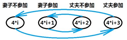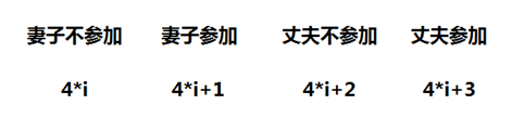 其中i的取值为[0, N),所以总的结点数为4N。我们为了方便处理,将“不参加”的结点定义为偶数编号,将“参加”的结点定义为奇数编号;并且,妻子编号模4为(0,1),丈夫编号模4为(2, 3)。每个结点可以表示成如下通项: