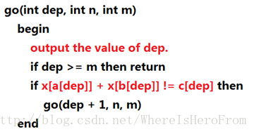 题解:虽然是个递归程序,但是它没有分叉,所以还是线性的。也就是一旦满足dep = m或者x[a[dep]] + x[b[dep]] == c[dep],函数就返回了。所以我们要做的就是将x[i]设置为合适的值,使得它能够满足的条件尽量多。