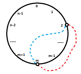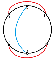 题意:一个圆上有n(n <= 1000)个结点,分别按顺序编号0,1,2…n-1,从圆上任意找两个点串起来,可以选择从圆里穿过(图7中蓝色虚线所示),也可以选择从圆外穿过(图7中红色虚线所示),每个结点只允许连一次。给定m对连接,问是否存在这样一种情况,所得所有连接之间互不相交。
