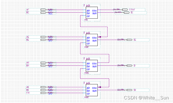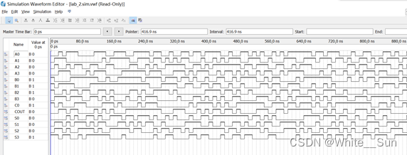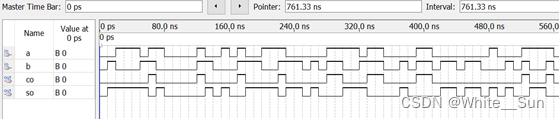 波形分析:sum的结果为ain、bin全加的结果,cin为进位标志,从仿真波形可以看出,sum满足两个二进制数ain、bin相加,并且输出cout加法进位。