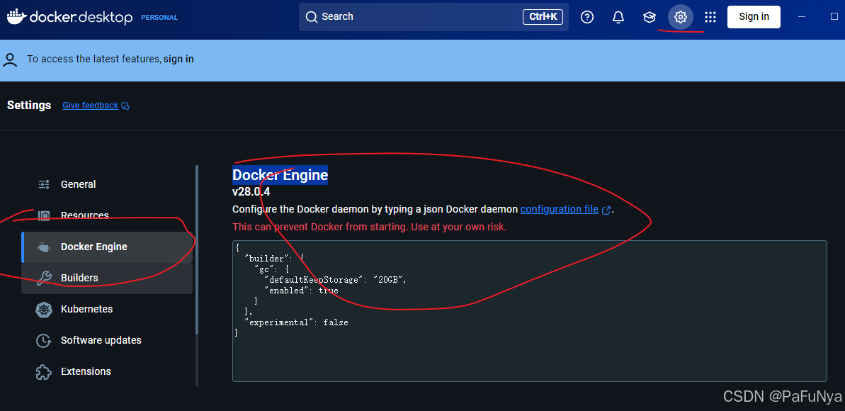别急我们慢慢来,点开左上角的齿轮,然后点击左侧Docker Engine