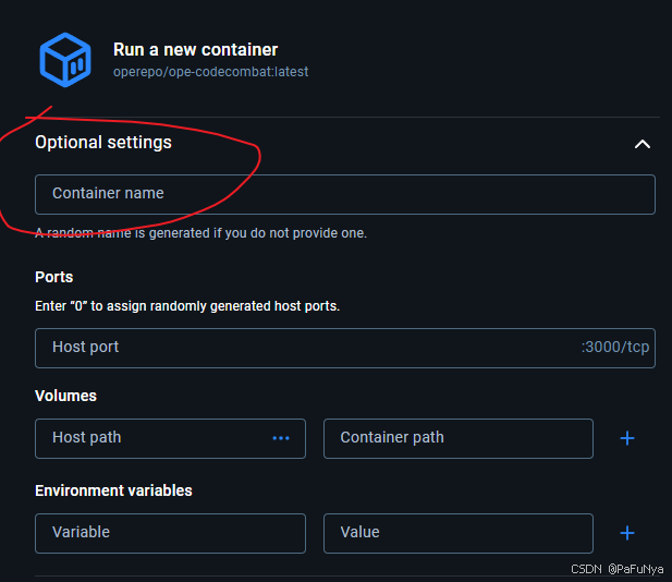 在这里可以设置容器的名称和映射的端口(不懂得只需要设置name和host port即可其他的不要动),name你自己定,host ports设置成3000