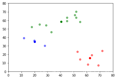 2.计算距离,得到关于每个点最近的中心点,让颜色与中心点相同表示一类