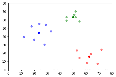 1.列出m个(x,y)需要分的点,初始化黑色,K=3,给出3个随机初始中心点,初始化3个颜色
