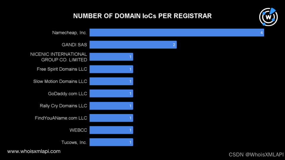 - Namecheap, Inc. 注册了四个域名;GANDI SAS 注册了两个域名;其他注册商包括 NiceNIC International Group Co. Limited、Free Spirit Domains LLC、Slow Motion Domains LLC、GoDaddy.com LLC 等