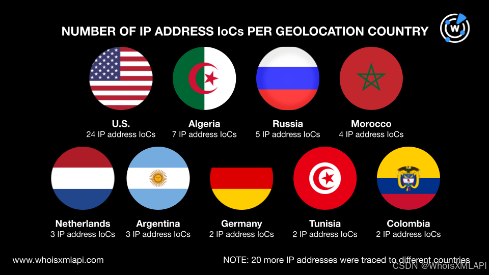 - 对于标识为 IoC 的 72 个 IP 地址,地理位置分布在 29 个国家,主要集中在美国(24 个 IP 地址)、阿尔及利亚(七个)、俄罗斯(五个)和摩洛哥(四个)。