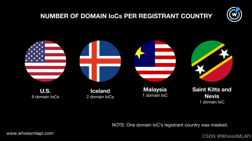 - 域名 IoC 的国家分布则集中在美国(九个域名)和冰岛(两个域名),马来西亚和圣基茨和尼维斯各一个。