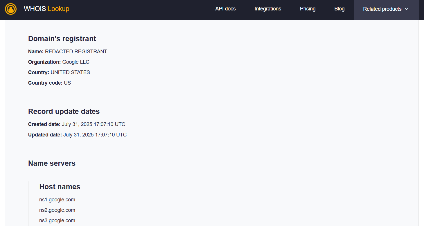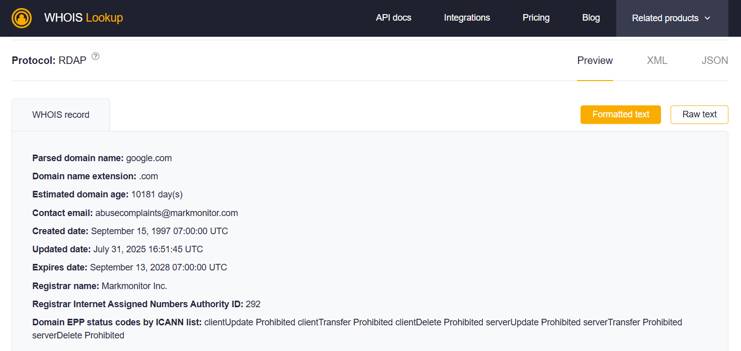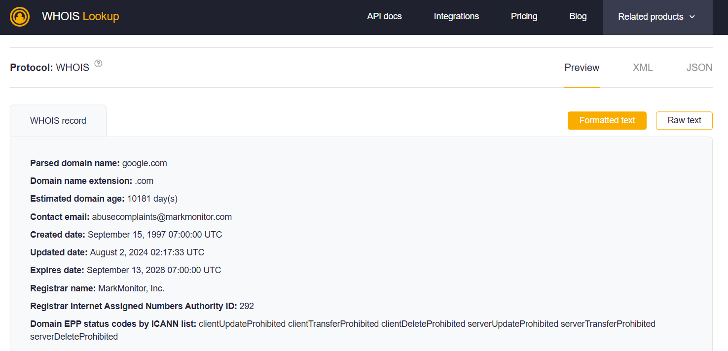 - WHOIS:这是传统的注册信息查询协议,目前正在逐步淘汰。值得注意的是,根据我们在多个顶级域(TLD)上的测试,WHOIS 协议在很多情况下依然可用。以下是通过 WHOIS 获取的 google[.]com 的注册信息示例: