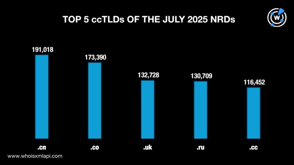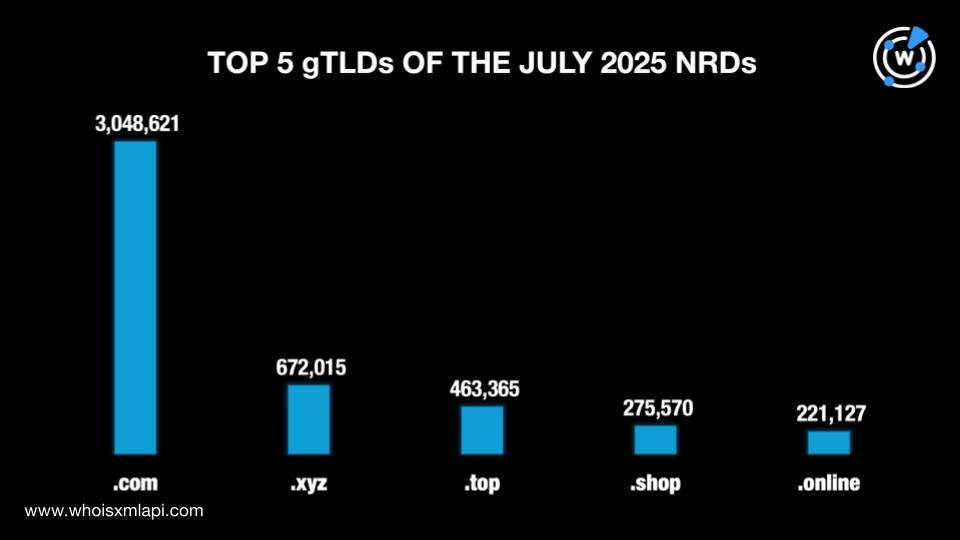 .com 顶级域名依然是最受欢迎的后缀,占所有新注册域名(NRD)总数的 36.4%,较 6 月的 41.8% 略有下降。其他进入前五的顶级域名与上月一样存在明显差距,其余四个均为通用顶级域(gTLD),分别是 .xyz(8.0%)、.top(5.5%)、.shop(3.3%)和 .online(2.6%)。