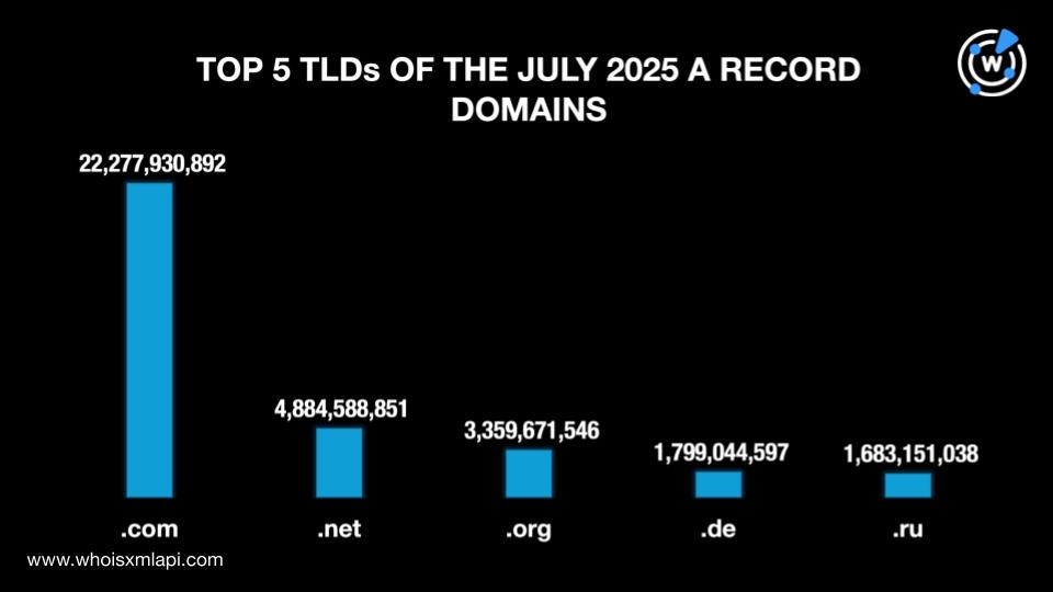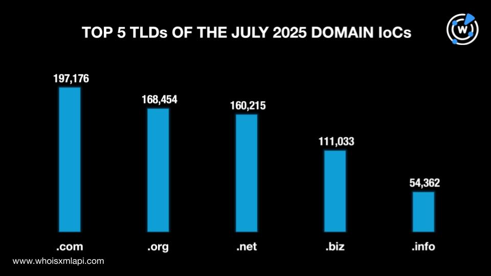 WhoisXML API 分析了 2025 年 7 月 1 日至 31 日期间注册的 830 万多个域名,旨在找出最受欢迎的注册商、顶级域(TLD)扩展,以及其他全球域名注册趋势。我们还统计了 2025 年 7 月 3 日 DNS 数据库 A 记录完整文件中的 493 亿多个域名的顶级域使用情况。接着,我们研究了 2025 年 7 月期间被检测为入侵指示器(IoC)的 110 万多个域名的主要顶级域分布。最后,我们总结了分析结果,并附上了该期间基于 DNS 和域名情报来源制作的威胁报告链接。
