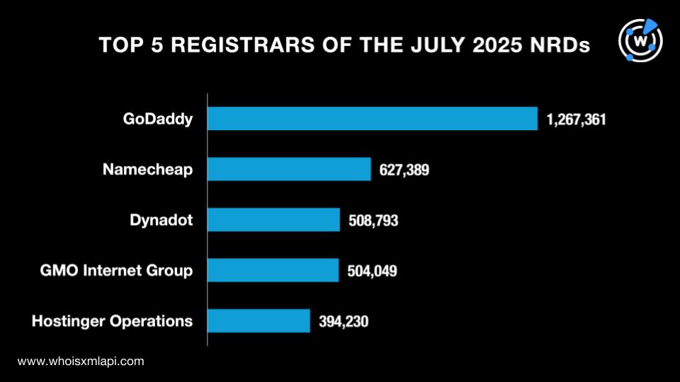 在注册商中,GoDaddy 继续占据主导地位,份额为 15.1%,高于 6 月的 11.6%。Namecheap 排名第二,占比 7.5%。其余前三名分别为 Dynadot(6.1%)、GMO Internet Group(6.0%)和 Hostinger Operations(4.7%)。